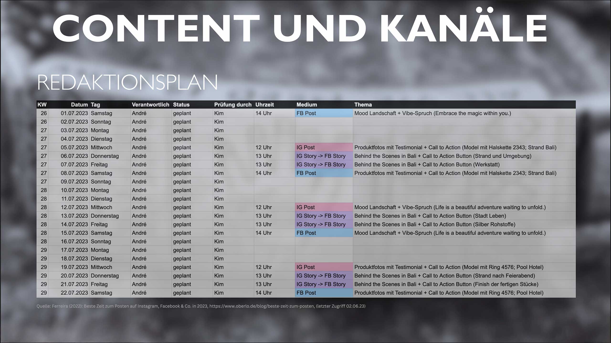 Abschließend wurde ein detaillierter Redaktionsplan entwickelt, der die Inhalte strukturiert und für eine konsistente, markengerechte Kommunikation sorgt. Dabei wurden Posting-Frequenz, thematische Schwerpunkte und saisonale Kampagnen strategisch geplant, um eine langfristig erfolgreiche Social-Media-Präsenz sicherzustellen. Gleichzeitig wurde das visuelle Konzept des Feeds optimiert, indem ein konsistentes Look & Feel mit klar definierten Farben, Typografie und Filterstilen festgelegt wurde, um eine einheitliche und professionelle Markenwahrnehmung zu gewährleisten.
